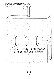 It is instructive to investigate two types of crack network. One of them is the network that develops in drying mud or paint. Similar networks are found in broken pavement, tile, plaster and other materials. Do the cracks tend to intersect at any particular angle? Do the "islands" left by the cracks fend to have any particular geometric I shape? Why do the tops of the islands in drying mud sometimes separate and then curl? Are the giant crack networks found on some playas (desert basins that temporarily become shallow lakes after heavy rain) similar to mud cracks? The other type of crack network is found in some ancient lava flows that formed pools on the surface, cooled, solidified and then cracked so as to form tall columns whose cross sections are hexagons and other polygons. When I walked over an outcropping of such columns at Giant's Causeway in Northern Ireland recently, I was surprised at the regularity of the formation. Why did cooling basalt crack in such an organized way? No one has advanced a definitive answer, but recent theories may have resolved part of the mystery. When a solid is placed under tensile stress by stretching forces, its molecular bonds resist the elongation. The ratio of the elongation to the initial length is called strain. If the strain is less than 1 percent, the bonds can be regarded as tiny springs linking the molecules; if the stress is removed, the solid regains its initial length as the springs contract. Under a larger strain a ductile solid first is distorted and then breaks. A brittle solid breaks immediately with no distortion. The mechanism of breaking is by means of cracks that form and then extend through the solid. Imagine a solid block under a uniform vertical stress. h Each vertical molecular bond along any horizontal line through the block shares equally in resisting the stress. The stress is said to be uniformly distributed over such a line.