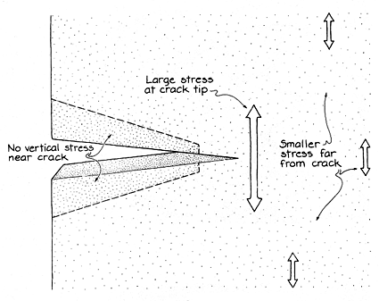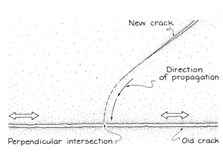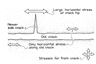 Suppose a small crack appears on one side of the block because of a local weakness in the material or a scratch on the surface. The stress on the block acts to pull apart the two faces of the crack. Molecular bonds are broken; the stress they would have resisted is shifted to the bonds at the tip of the crack, increasing the stress there. It may break those bonds, extending the crack into the block. The process can be repeated at the new tip. In this way the crack travels though the block. It may move almost as fast as the speed of sound or it may travel in spurts. Its movement tends to be straight unless it encounters points of weakness, in which case the path becomes sinuous. Suppose the block is under both vertical and horizontal stress when a crack develops horizontally. The vertical stress in the material along the faces of the crack is relieved, but the horizontal stress is still there. It may initiate a side crack that begins to travel at right angles to the original crack. Where points opposite each other on the faces of the original crack are weak, side cracks can develop. They travel in opposite directions.