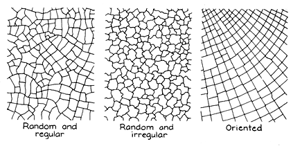 When a crack travels toward an older crack at some angle other than 90 degrees, it comes under the stress that is parallel to the sides of the old crack. The distribution of stress around the tip of the new crack becomes asymmetric. The new crack changes its direction of travel so that the angle between the cracks gradually increases to 90 degrees when the cracks join. The new crack then ends. With these general rules you can often determine the history of a crack network. Pick out a long, more or less straight crack that has many intersections. The side cracks that extend from it but do not reach another crack must have been formed by the stress parallel to the faces of the main crack. The side cracks that intersect other cracks either began on the main crack or traveled there. In both cases the intersections with the main crack are perpendicular to it. To make a record of how the network formed draw a map of what appear to be the oldest cracks. The islands they create are large and quite likely four-sided because of the perpendicular intersections. Add the side cracks. They create smaller islands, which are probably four-sided also. In a complex network of cracking you might be able to discern several generations of cracks. In 1962 Arthur H. Lachenbruch of the U.S. Geological Survey classified polygonal crack networks in terms of their dominant intersection angle. One class contains all networks with nonperpendicular intersections. The networks with perpendicular intersections are grouped according to whether they are randomly formed or are oriented because of an asymmetry in the stresses producing them. The randomly formed group is further classified as having either irregular or regular polygons according to whether the sides of the polygons are sinuous or approximately straight. In some cases a network that begins as a system of irregular polygons may develop enough additional cracks to become a system of smaller regular polygons.