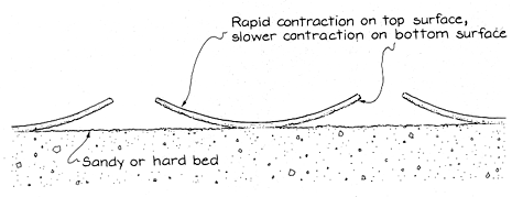 Longwell described fine clay material as being ideal for this extreme curling, presumably because it contracts so much when it is dried. Silt develops only concave plates; when sand is mixed into clay or silt, there is no curling. If there is an underlying bed of sand, a thin top layer of clay or silt may separate from it. Hence curling can be found in regions where a recent rain had washed a think layer of clay or silt over a sandy or hard bed. I find curls when a thin layer of mud dries on my stone patio. I examined crack networks in a solution of cornstarch that I mixed by hand in a large, rectangular baking dish until all lumps were gone. After several hours a layer of water had separated from the solution. I removed it with a rolled paper towel that I dipped into the water and hung over the side of the dish. When I examined the dish a few days later, the cornstarch looked dry, but it had not cracked. Then, within an hour, several large cracks appeared across the length of the material and smaller ones appeared at the edge. Their paths were obviously influenced by the shape of the dish. The cracks that subsequently formed in the isolated islands were independent of the dish shape. Often they curved to intersect at right angles with older cracks, which were widening continuously with further shrinkage of the material. Some of the polygons began to curl upward, but later they flattened out.