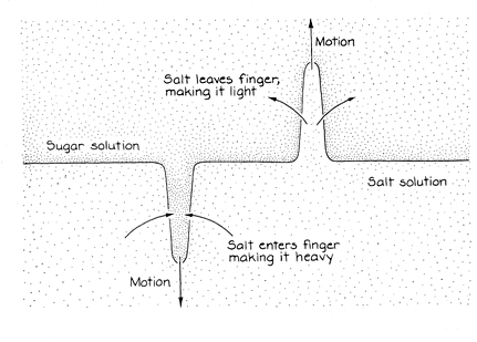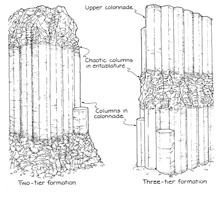 These formations present two enduring puzzles. Why should rupturing create splendidly shaped columns in the colonnades and irregular ones in the entablature? Why is the transition between tiers so sharp and so extensive horizontally? For hundreds of years scholars have proposed varied theories to explain these lava formations. Among the more recent ones are an idea put forward in 1978 by Michael P. Ryan and Charles G. Sammis, who were then at Pennsylvania State University, and another idea advanced by Lakshmi H. Kantha, then at Johns Hopkins University. Ryan and Sammis considered the solidification of a pool of lava. As a pool solidifies, the upper and lower interfaces between the solid and the liquid move slowly into the interior. As the upper interface progresses, for example, a cooling solid layer is left above it. Contraction that accompanies the cooling process puts the layer under tensile stresses that build up until the layer suddenly ruptures into a network of cracks. In 1959 the Kilauea volcano in Hawaii filled a crater with lava to a depth of more than 100 meters. Observations by means of boreholes indicate that the upper solid-liquid interface is descending at the rate of about one centimeter a month. Occasionally shock waves are recorded. They can even be felt and heard when one walks on the now solid top surface. They seem to result from the sudden fracturing of a solid layer just above the interface. The layer appears to be no more than .5 meter thick when it fractures. In such a case the theoretical calculations that predict a trend toward hexagonal polygons may be applicable. As the solid-liquid interface continues to descend, the crack network may follow it, thereby forming columns. Ryan and Sammis worked out details of how the process might operate. They argued that the cracks propagate vertically by means of a combination of Mode I and Mode III fracturing. Indeed, there seems to be evidence of such propagation along the length of the columns they examined at Boiling Pits. Although the explanation may be correct, it fails to account for the formation of tiers or their knife-edge transitions. Could some feature of the liquid leave its trace in the solid and thus influence rupturing and the subsequent formation of columns and tiers? Benard cells are a candidate. Under certain conditions a liquid heated at the bottom or cooled at the top can develop hexagonal convection cells with fluid rising within the cells and descending at their perimeter. Benard cells, however, are short in relation to their width-nothing like the long, thin columns in basalt. In 1981 Kantha noticed that the tiering in basalt resembles the fluid-flow phenomenon called salt fingers. The fingers are thin columns of fluid that form at the interface between two solutions because of a difference in the diffusion rate of the molecules in the solutions. With patient work you can demonstrate the phenomenon in your kitchen. Get a transparent container, preferably rectangular in order to avoid refraction of light by curved surface. Mix salt into water several centimeters deep. In another container wit a pouring lip mix a sugar solution about the same amount of water. Add a drop of food coloring. Pour the sugar solution slowly onto a spoon held just at the top of the salt solution. The sugary liquid mixes gradually with the salty one. The density of the sugar solution should be slightly less (specific gravity 1.1) than that of the salt solution (1.12), in which case the sugar solution should spread into a layer over the salt solution. Although the distribution of densities is stable, the arrangement become unstable with any small disturbance of the interface. Suppose the interface bulges upward. The bulge contains saline solution. Because salt diffuses faster than sugar, salt diffuses from the bulge into the surrounding sugar solution faster than sugar diffuses into the salt. The bulge becomes lighter than the surrounding solution and moves upward. As the process continues, the bulge becomes a finger. An hour or two after you pour the sugar solution the interface develops short columns, each a millimeter or less in width. Above and below that region the solutions are mixed by convection. With time the columns grow longer, wider and better defined and, develop polygonal cross sections. The transition between the columns and the mixing layer above it resembles the two-tier formation in basalts. A three-tier formation can be made if the density of the salt solution decreases with height. You will observe a middle layer where the mixing is turbulent. Above and below it are columnar layers. (In both demonstrations you can see the columns better if you stand a meter or so away from the; container and move your head to the left and right so that the refraction of; light by the columns produces a weak scintillation.) Kantha hypothesized that fingers in lava gave rise to the fracture network seen in columnar basalts. When the basalt solidified, cooled, contracted and cracked, the cracks tended to follow the edges of the polygons that were formerly the fingers. The cracks then traveled vertically as the crack net work followed the solid-liquid interface. The exciting aspect of this explanation is that it neatly explains the knife-edge transitions between tiers in the basalts. They mark the ends of fingers. Was Kantha right? Work now being done seeks to test the explanation and to show how fingers could form in molten basalt.