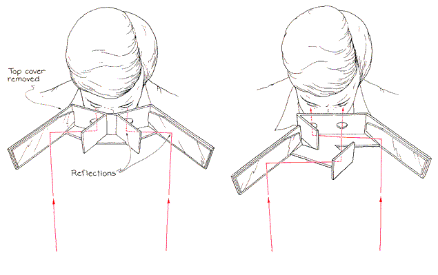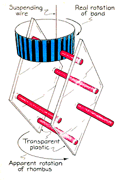 Many other familiar objects take on a strange appearance through the hyperscope. For example, a person's face looks thinner and seems to have a prominent nose. All the objects immediately return to their normal appearance if you close one eye while still looking through the instrument with the other one. Because you are no longer able to compare retinal disparity or convergence angles between the eyes, you are left with only the pictorial cues about depth. Another of Pope's instruments, the pseudoscope, makes use of mirrors to switch what the eyes are seeing. The exchange reverses the cues about distance from retinal disparity, sometimes causing a distant object to seem closer than a nearer one. The exchange of depth is most vivid for me when I look through the pseudoscope at complex arrays such as trees or brush. Branches at the rear of a tree seem closer than branches at the front. The sight is eerie because I realize that the front branches partially block my view of the rear branches. Depth is also inverted when I look at an object that can easily be reversed mentally. For example, a pot hung bottom out on the kitchen wall suddenly appears to bulge inward rather than outward. Pope has made several constructions of transparent plastic that seem to move surprisingly when a pseudoscope inverts them. One is a rhombus consisting of two plastic parallelograms held together by four metal rods. The rhombus is suspended by a thin wire. Propped on top of the rhombus is a band of alternating green and black stripes. One of the rods passes through the band to hold it in place. I suspended this device from a ceiling lamp fixture, rotated the rhombus to twist the wire, released it and then viewed it
