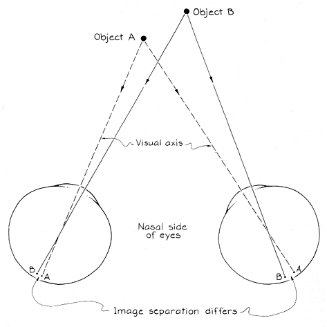 Retinal disparity depends partly on the separation between the two eyes, which is about six centimeters. Pope set out to explore what happens to perception if the separation is changed. One of his instruments, the hyperscope, effectively increases the separation to about 20 centimeters by means of reflections from mirrors. Similar instruments were studied by Charles Wheatstone and David Brewster in the 19th century. The increase in the effective distance between the eyes increases the retinal disparity of images formed on 9 the retinas and the difference in convergence angles when you look from one object to another at a different distance. Suppose you look at A through the hyperscope while B is also in view. The new disparity of separation between the images of the two objects 9 on the retinas forces you to perceive greater depth between them. You also perceive greater depth because the difference in convergence angles for the objects is now greater. The hyperscope also alters the apparent height and width of nearby objects. In normal vision you are accustomed to a certain relation between the size of an object's image on the retina and the object's distance, as implied by the convergence of the eyes when you look at it. Seen through the hyperscope, an object looks smaller because the angle of convergence required to see it through the mirrors is larger than normal.
