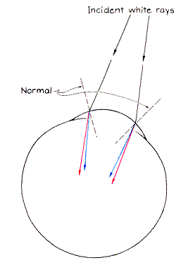 In 1965 B. N. Kishto, a resident of the Indian Ocean island of Mauritius, described in Vision Research ways to demonstrate chromatic dispersion by illuminating only one side of each eye. To repeat one of his demonstrations I block the nasal half of each eye's field of view with a card as I look at the colored circles. The light entering the eye on the uncovered temple side is refracted. Blue light is directed more than red toward the normal at the corneal surface. Dispersion is enhanced by the lens of the eye. The blue image ends up on the nasal side of the red image. The blue circle looks farther away than the red one. Next I block the temple half of each eye's field of view. Although blue is still refracted more than red, the new orientation of the normal changes the relative locations of the images. The blue image is now on the temple side of the red image, and as a result the blue circle now appears to be closer than the red one. The same results can be obtained with a pinhole. Make a hole about two millimeters in diameter in an index card. Look at the colored circle with one eye closed and the pinhole in front of the other eye. The blue circle seems farther away than the red one when you position the pinhole on the temple side of the open eye. The apparent depth is reversed when the pinhole is on the nasal side. The pinhole creates another illusion. Look through the pinhole and move it toward the temple and nasal sides of your view as far as you can without losing sight of the circles. The lateral (left-right) separation between the circles changes, being smallest when the pinhole is at its extreme nasal position and largest when it is at its extreme temple position. The increase in dispersion on the temple side results from the skewed alignment of the visual axis with the line of symmetry passing through the lens.