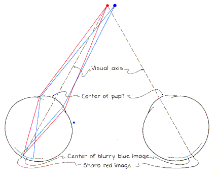 Light rays can enter the eye farther off the axis on that side than on the other side, thereby putting more of the blurry image on the nasal side of the axis. Second, additional bias in the position of the blurry image results from the skewed pathway of the visual axis through the lens of the eye. The line of symmetry through the lens lies on the temple side and at an angle of about five degrees to the visual axis. Light passing through the temple side of the lens is dispersed more than light that h passes through the nasal side. The arrangement of the blue image on the nasal side of the red image creates the illusion that the blue circle is farther away than the red one. The apparent depth is not altered if you switch your gaze and focus it sharply on the blue circle. In each eye the blue image then lies on the point where the visual axis intercepts the retina. The red rays, which are less strongly refracted, tend to focus behind the retina. When they reach the retina, they form a blurry image. The center of this image lies on the temple side of the blue image. Again the blue circle seems to be farther away because the blue image still lies on the nasal side of the red image.