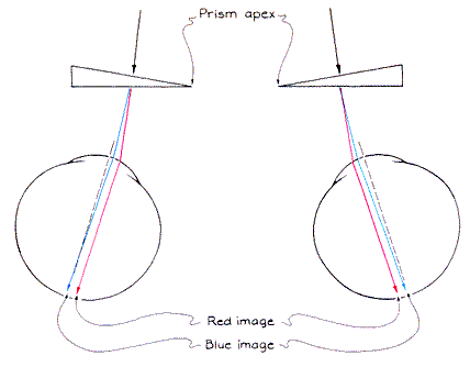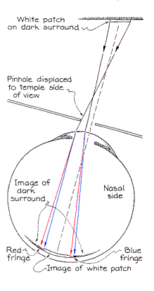 Kishto also showed how the dispersion of light can produce colored fringes on a small white patch with a dark surround when the patch is viewed through a pinhole. To test this result I pasted a small white rectangle on a black card. When I hold the pinhole on the temple side of an eye, that side of the white patch is fringed with blue and the nasal side with red. When I move the pinhole to the nasal side of the eye, the colors reverse. White light from the patch is dispersed into colors when it enters the eye. In the center of the retina, however, the color from one point of the patch overlaps colors from other points to re-create a perception of white. You therefore see color only along the left and right edges of the rectangular patch. In several other experiments Kishto described, observers viewed equidistant colored patches through narrow glass prisms in order to increase the dispersion of light. When the apexes of the prisms pointed toward the temple side of each eye, an observer had to decrease the convergence of his eyes to see the patches. In this situation a red patch seemed closer than a blue one. The situation was reversed when the apexes pointed toward the nasal side of each eye.