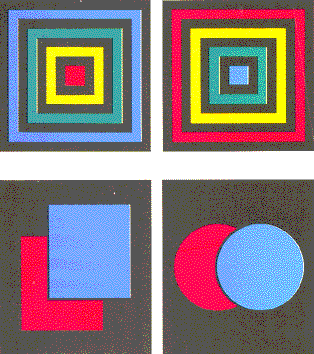 The illusion of depth worked best when the patches occupied about one degree in the field of view and were separated by about a quarter of a degree to half a degree. In some trials an observer viewed an array of four patches of different colors. With certain color arrays the inner corners of the patches seemed to curl up or down in relation to the plane of the outer corners. The illusion of depth is weaker at the more distant outer corners. Joseph Hodych of the Memorial University of Newfoundland has suggested that contour maps of magnetic fields in the ground be coded in colors and then viewed through a large magnifying lens so that the relative strength of the fields is represented by the perceived depths of the colors. The lens is in effect Kishto's first arrangement of two prisms. In another set of experiments observers viewed arrangements of colored and black strips designed to give pictorial cues about depth. In one case the order of the colored regions from the central square outward was red, yellow, green and blue. When this pattern was viewed with both eyes looking through prisms whose apexes were directed toward each other or with one eye looking through a pinhole on the nasal side of the eye, it resembled a hallway. When the experimenter reversed the order of the colors, the pattern looked like a bellows projecting toward the observer. If the pattern is colorless, its depth cues are ambiguous. I can see it as either a hallway or a projection toward me. With the extra sense of depth generated by the colors I become locked into one of those perceptions. With another pattern [see bottom illustration at left] the pictorial cue that one object is blocking my view of a more distant object is so strong that the color-stereoscopic phenomenon cannot change my perception of depth in the pattern. You might enjoy investigating other patterns where pictorial cues enhance or oppose the illusion of depth created by adjacent colors.