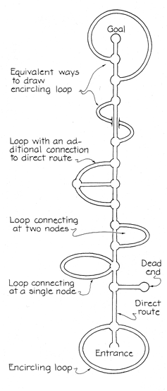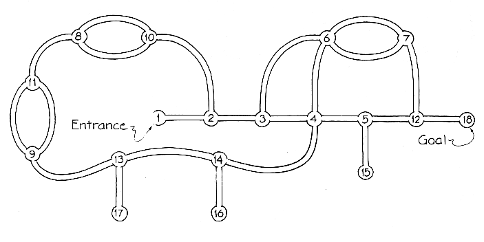 The complexity of a maze can be greatly reduced if a map of it is topologically distorted into a simpler pattern called a network. In such a pattern all the nodes and interconnections are retained but the twisting of pathways is eliminated. In a network for the Chevening maze a direct route of 1-2-3-4-5-12-18 to the goal is easy to see. Another route, 1-2-3-6-7-12-18, is just as good because it involves the same number of nodes. Each loop in the network is produced by an island. In a network a direct route from the entrance node to a goal is laid out in a straight line. A dead-end branch leaves the direct route and does not return. An island at the entrance creates a route that encircles the entrance node. It can intersect the direct route at one node with four branches or at two nodes. The hand rule for exploration fails with this closed route. Another loop encircles the goal, again nullifying the hand rule. An encircling route can also be drawn as passing under the direct route. Interior islands create loops that intersect the direct route at either one node or two nodes. Note that if you pass into such a loop with the hand rule, you eventually escape from the loop and continue along the direct route toward the goal. More complicated loops that make additional connections with the direct route can also be escaped from.