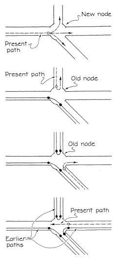 Since the hand rule does not guarantee success in reaching the goal, how should one explore a maze? Several techniques are known, but the one most widely cited is credited to one M. Tremaux in the 1882 publication of Édouard Lucas's Récréations mathématiques. In the illustration of it at the left the terms old node and new node record whether a node has been visited before. As you enter or leave a branch, mark the wall or the floor somehow. Whenever you come to a new node, choose any branch. If you come to a dead end, return to the previous node. If you travel along a path previously untraveled and reach an old node (it will have marks on at least two of the branches), go back to the node you just left. If you are on a previously traveled path, choose a new branch. If that is not possible, choose a branch that has been traversed only once. This procedure is laborious and will probably take you along a lengthy route, but it avoids all traps. Suppose you enter a maze, pass a number of nodes without taking notes or marking your path and then realize you are lost. How can you best return to the entrance without moving hopelessly deeper into the maze? In 1959 Oystein Ore of Yale University published a procedure for dealing with such a situation. Imagine that in a maze network you are at a point x and not only have lost your way but also have forgotten the number of nodes through which you have passed [see bottom illustration at left]. From x explore each branch until you come to another node. As you enter the branch, mark it with a 1. If you come to a node that has new branches, mark the branch you are in with another 1 and return to x. If you come to a dead end, mark the branch as being closed when you return to x. If a branch loops around in such a way as to return to x, mark each end of the branch as being closed.
