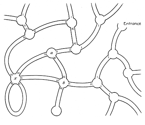 Next explore each unclosed branch to a distance of one additional node. As you leave x, add another mark of 1 to the entrance of the branch. When you leave the branch at the next node (which you reached on the preceding venture), mark another 1 at this nodal exit point. (The node now has two marks.) As you enter a new branch at the node, mark 1 at its entrance. If the branch is a dead end, return to the node you just left and mark the branch as being closed. If you come to a node that you have already visited from some other branch leading from x, mark each end of the branch you are then in as being closed. An example is the branch connecting nodes a and b in the illustration. Return to the node you just left. When you have completed the explorations from x to a distance of two nodes in all possible directions, return to x and begin exploring to a distance of three nodes. Remember to add a 3 to each branch as you enter it and as you leave it. Note that at any distant node you can always determine the e direction back to x by comparing the marks on the branches: the branch leading back to x has the higher number. The illustration represents explorations to a distance of three nodes. You will regain the entrance when you extend the explorations to a distance of four nodes.
