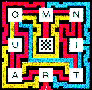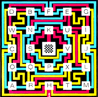 Minotaur Designs is a small company that builds full-size mazes in England and other countries. Adrian Fisher, one of its partners, sent me drawings of three of the company's unique color mazes. The first maze, called "A*maze*ment," was originally laid out in Epsom for an exhibition. You can follow the drawing of it at the left with a finger or a pencil. You enter the maze on the red path leading to node R and attempt to reach the goal at the center by way of a minimum of nodes. At each node you must change colors. For example, if you reach node I by the blue path, you cannot leave it on another blue path. The maze design contains many more nodes than the eight indicated by letters. For example, node I is actually two distinct nodes, one if you enter it on a red branch and another if you enter it on a blue branch. If you draw a 3: network for this maze, you must include one node for the blue I and another node for the red I. The second color maze is called "Alphabet Soup." It too requires a change of colors at each node. Beginning on the red path to node H, what is the lowest number of nodes needed to reach the goal in the center? This maze is cleverly designed. If you attempt to work backward from the goal, a standard technique among maze enthusiasts, you quickly lose your way. The; interior of the maze, marked by the square defined by 0, D, G and L, is difficult to breach. Many paths extending from the entrance loop back to the entrance. After I had figured out how to reach the interior, I discovered several direct routes with 11 nodes (counting the goal and considering H as the first node), but a direct route of 10 nodes took longer to discover. I think it is the minimal route.
