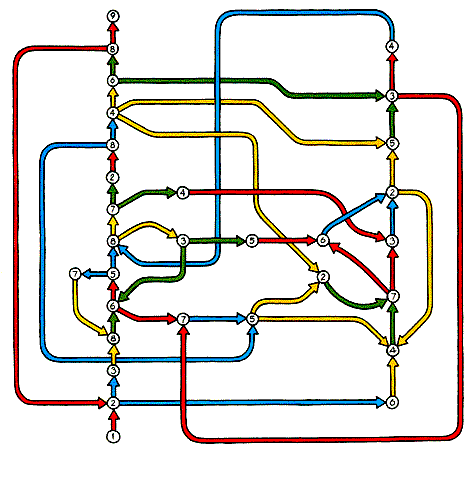 The third maze, called "The Giant's Bridge," imposes a different restriction at the nodes. You are required to choose a new branch according to the sequence red, blue, yellow, green. If you enter a node on a red branch, you; must leave on a blue one. Green calls for red and so on. The center of the maze contains a bridge and an underpass of branches. What is the lowest number of nodes needed to travel from node 1 to the goal of node 9? Fisher's solution (in the form of a network) is shown in Figure 10. Note that like the other color mazes, the network contains many more nodes than are readily apparent in the maze itself. The properties of networks were initially outlined in 1735 by the eminent Swiss mathematician Leonhard Euler. Consider any connected network. A node is said to be odd or even according to the number of branches joining it. A route is any consecutive series of branches in which no branch is traversed twice. A reentrant route ends where it begins. A unicursal route goes through the entire network without repeating a branch.