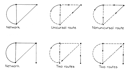 Euler set forth four general rules concerning networks. (1) The number of odd nodes must be even or zero. (2) If a network has no odd nodes, it can be traveled unicursally by beginning at any node. Moreover, any such route is reentrant. (3) If a network has only two odd nodes, it can be traveled unicursally by a route that begins at one of them and ends at the other one. Any route that begins at an even node, however, cannot traverse the network unicursally. (4) Any network that has more than two odd nodes cannot be traveled unicursally by a route. It can be fully explored by several routes without traveling over a branch more than once. If it has 2n odd nodes, it can be fully explored in n routes. Examples of the rules appear in Figure 11. In the first network the number of odd nodes is even. If you begin at one of the two odd nodes, you can travel unicursally through the entire network to end at the other odd node. If you begin at the one even node, you need two routes to explore the full network. The second network has an extra branch. Again the number of odd nodes is even. Since there are now more than two odd nodes, a unicursal route is impossible. Exploration of the full network requires at least two routes. Two examples are shown.