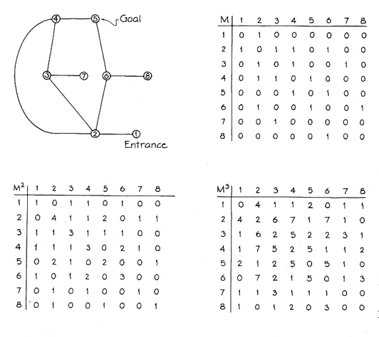 Often, but not always, a maze has an odd node at the entrance and another one at the goal. If all the other nodes are even, you can travel from the entrance, through the entire maze and to the goal without going through any branch more than once. If there is even a single additional odd node, however, you will have to travel over at least one branch twice in order to explore the entire maze. The study of networks, now called graph theory, is widespread in mathematics, electrical engineering, computer processing, route designing and many other fields. Graph theory involves networks of the types applicable to mazes with one exception: it does not allow a branch to leave a node and then loop back to that node. A maze loop of that kind can nonetheless be altered to fit graph theory by inserting an artificial node into the loop. In a maze this node would be a trivial one, involving no decision other than one to quit the current direction in a branch and return to the previous node before the next node is discovered. Graph theory offers an elegant way to tackle a maze in which you are required to find a minimal route. You begin by constructing a matrix of the connections between successive nodes. The maze network shown in Figure 12 has eight nodes, its matrix is a square with eight elements on a side. The number of connections between successive nodes is entered as an element in the matrix. For example, since there is one connection running from node 1 to node 2, the element with coordinates of 1 (vertical) and 2 (horizontal) is 1. Since you could also travel from node 2 to node 1, the 2-1 element is also 1. If there were two connections between successive nodes, the corresponding element would be 2. A O is inserted at all the empty elements. Call this matrix M. Note that it is symmetric around a diagonal running from the top left to the bottom right. The symmetry results from the fact that you can travel along any branch in either direction.