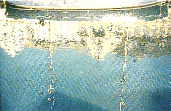 silhouetted against the sky was in front of me. Within my shadow on the puddle I saw reflections of the building and the sky. The apparent distance to the building equaled the true distance between the building and the puddle. I seemed to be looking through a hole at the bottom of the puddle. The image of the building's concrete walls was dim. The images of the windows were brighter because the windows scattered more light than the walls. The image of the sky was even brighter. I could see my reflection if I looked almost directly down on the water. Light from the surroundings was scattered from my face and then was reflected from the air-water interface. Faint colors were also visible. Deep pools of clear water often display indistinct shadows. The penumbra is broader, decreasing the visibility of the shadow, and there is more opportunity for light to be scattered to you from within the shadow region. The appearance and the position of your shadow in a pool change markedly if the water is turbid. The light is scattered from the suspended particles. If the concentration of particles is moderate and the water is not too deep, light may still reach you by being scattered from the bottom. Your shadow is visible but its edges are muddled because the scattering does not take place in a single plane. The interior of the shadow is brightened by light being scattered from the shadow region. With more turbidity the amount of light reaching the bottom is insufficient for you to see a shadow there. Instead you see light that is scattered from the suspended material near the surface of the pool. Your shadow then seems to lie near the surface, probably again with muddled borders.