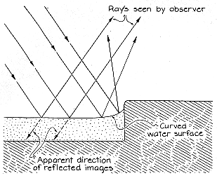 two uneven concrete slabs. The flat section of the puddle reflects the surroundings as a mirror would, but the part next to the step yields distorted reflections. The surface there is curved because of the molecular attraction between the water and the concrete along the side of the step. Similar distortions are caused by the curved surfaces surrounding leaves and other objects that float in a puddle. If a pencil is inserted vertically into a puddle, the water is pulled up along its shaft. The sudden change in the reflected images creates the illusion that the pencil pulls images toward it. Actually the curved water surface reflects images to you from objects farther to one side of you than the flat water surface did. In 1953 Stephen F. Jacobs of the University of Arizona noted a curious pattern that can be seen when breezes blow over a pool of moderately turbid water at least a meter deep. Stand somewhat above the water and look at it near the shadow of your head. Flickering bright streaks seem to radiate from the shadow. They may create the illusion that the entire pattern rotates about your head.