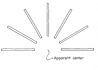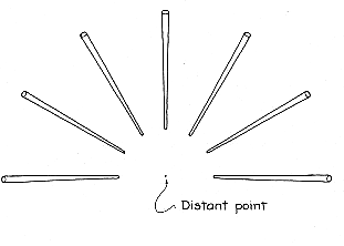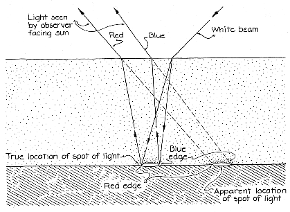 parallel rods [see illustration at left below]. The scene offers at least two cues about depth. The outer ends of the rods seem to be near because their faces are visible. The tapering of the rods also reveals depth. Without the cues you might see the figure as a flat array of rods aligned along radial lines from the center of your perspective. You make a similar interpretation of the streaks in the water. Lacking cues about depth, you conclude that they are on the surface and that they point toward the position of the eyes in the shadow of your head. A coloring that can appear in clear water was discovered by Frank S. Crawford, Jr., of the University of California at Berkeley while he was relaxing in a hot tub. The water was dappled with sunbeams streaming through the leaves of a tree. A companion noticed that the spots of light formed by the sunbeams on the bottom of the tub were either completely white or had colored edges, depending on how they were viewed. If you sit with the sunbeams passing over a shoulder, they are white. If you sit facing the sun, the near edge of a spot is red and the far edge is blue.