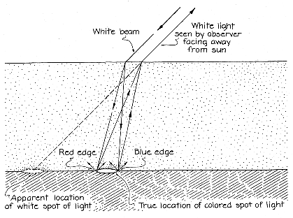 The colors are due to the spread of the color components in the initial white sunlight as it is refracted into the water. The blue changes its direction of travel at the interface more than the red does, the intermediate colors green and yellow change directions by intermediate amounts. Because of the spread, the red light and the blue light are scattered from the bottom at different points. If you sit with your back to the sun, the only rays that return to you from the bottom are those that travel almost in reverse along the initial path of the light. A ray of each color travels back to you in this way, passing through the same point on the water-air interface. You perceive the combination of colors as being white. The source of the light appears to be a single spot on the bottom. The spot is displaced from the true scattering points for the colors because you do not allow for the refraction of light at the water-air interface. If you sit facing the sun, the rays of various colors are scattered from the bottom and pass through the interface at