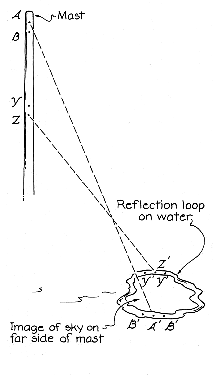 To understand the loop's formation, label the points on the section of mast and their corresponding points in the loop. Call the highest point A and its reflection A'. The next-lower point on the section, B, is reflected twice in the loop, once on each side of A'. Call the lowest point on the section Z and its reflection Z'. The next-higher point on the section, Y, has two reflections, one on each side of Z'. All the points between A and Z have two reflections in the loop. Thus the section is imaged as a closed loop. David K. Lynch of the Aerospace Corporation Space Science Laboratory in Los Angeles elaborated on Gold's observations by noting that a pool of water covered with waves can also display "land pools" and "sky pools." These images are small, isolated patches that reflect extended sources of light such as mountains. A point source of light can also create an extended image. If it is photographed with a slow shutter speed, the image is sinuous and probably overlapping because the waves move during the long exposure. If the shutter speed is fast, the image is a short line, with ends corresponding to the opening and closing of the shutter. You might like to study further the different types of reflected images that can be photographed in these circumstances.