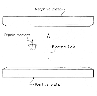 Microwave frequencies range from 1 X 109 hertz (cycles per second) to 5 X 1012 hertz, well below the frequency of visible light (approximately 6 X 1014 hertz). My oven emits waves at the frequency of 2.45 X 109 hertz, or 2.45 gigahertz. Except for the frequency, microwaves and visible light are similar. Each can be pictured as a wave of oscillating electric fields. A water molecule can be rotated by the electric field of a microwave because of the arrangement of the electric charge within the molecule. The electrons (negatively charged) associated with the hydrogen atoms are shifted toward the oxygen atom because of their strong attraction to the eight positively charged protons in the oxygen. The shift leaves the oxygen end of the molecule negative and the hydrogen ends positive. Such a charge distribution is called an electric dipole. Although the molecule as a whole is electrically neutral, it contributes an electric field to its surroundings and can be rotated by an electric field imposed on it. The dipole moment is the product of the net charge at each end and the separation between the charges. The moment is represented by a vector that points from the negative oxygen end along the line of symmetry between the hydrogen ends. Ordinarily the dipole moments in water are randomly oriented. If an electric field is imposed, however, it creates a torque on each molecule. The torque makes the molecule rotate to align its dipole moment with the field. Picture an electric field produced by two charged, parallel plates. The direction of the field is from the positive plate to the negative one. The water molecule rotates so that it presents its negative end to the positive plate and its positive ends to the negative plate, thereby aligning itself with the field. Every molecule is constantly buffeted by the random thermal motion of the surrounding molecules. The random motion, which sometimes goes by the name of Brownian motion, is related to the temperature of the water. Heat gives the molecules more kinetic energy, so that in their random motion they strike one another more vigorously. The temperature rises.
