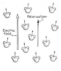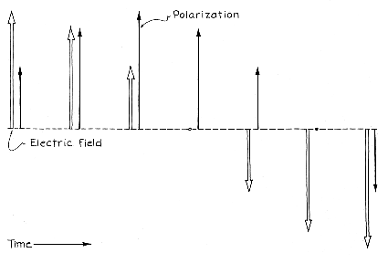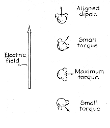 The polarization of water is expressed as the net dipole moment per unit of volume. It is zero when the dipole moments are randomly oriented, because for every moment pointing in one direction another moment points in the opposite direction. When an electric field begins to align the dipole moments, polarization increases. It would be at a maximum if all the dipoles were in alignment. Random molecular motion, however, continuously knocks dipoles out of alignment, keeping the polarization below the maximum level. Now for the first hypothesis. Early in this century the eminent Dutch physicist Peter J. W. Debye demonstrated mathematically why microwave energy is strongly absorbed by water. The key fact is that water molecules cannot rotate instantaneously into alignment with the electric field. Since they have a mass spread over a certain volume, it takes time for torque to make them rotate. The retarding forces from surrounding molecules also affect rotation. The response time of water can be considered in terms of the decay of its polarization if an electric field is suddenly turned off. Random molecular motion then begins to destroy the alignment of the dipole moments. The effect is to reduce the polarization exponentially with time.