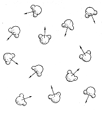 The best candidate for the process is a group of three water molecules in a particular arrangement [see Figure 8]. The middle molecule is attached to the second molecule by one of its own hydrogen ends. The other hydrogen end is free. Attached to the oxygen end of the middle molecule is the third water molecule. The attachment is by way of a hydrogen end on the third molecule. The position of the attachment is important. Calculations indicate that there are two sites at the oxygen end of the middle molecule where the attachment would lower the potential energy the most. Attachments at other places are therefore less likely. For example an attachment is not likely to be made near the free hydrogen end of the middle molecule because that hydrogen end will repel the hydrogen end of the third molecule. The torque on the middle molecule from the electric field of a microwave may be large enough to break the hydrogen bond with the third molecule. After the middle molecule rotates, the third one could reestablish its hydrogen bond at the other low-energy spot on the oxygen end of the middle molecule. Such a process puts energy into the random motion of the group. The field supplies energy to break the initial hydrogen bond. When the bond is reestablished, the energy goes into the kinetic energy of the group. In this way the microwave energy ends up as heat. So much for hypotheses on how the water in food rapidly absorbs microwave energy. I shall now turn to some of the other things that go on in a microwave oven.