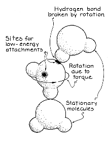 A more refined model explaining how microwaves heat water has since been proposed. It is the third hypothesis. In addition to individual molecules water is made up of many short-lived groups of molecules. The groups are held together by hydrogen bonds: the hydrogen ends of one molecule are attracted to the oxygen end of another molecule. Every time two or more molecules form a group they lower their electric-potential energy. The difference in energy is added to the kinetic energy of the group's random motion. The temperature does not rise because on the average the number of molecular groups that form equals the number of groups broken apart by collisions from the random motion, leaving no net gain in the energy of the random motion. A microwave adds energy to the random motion if the torques it places on the molecules break some of the hydrogen bonds in the groups. (The electric field supplies the energy to break the bonds.) When a liberated molecule again forms a hydrogen bond with a group, the decrease in potential energy goes into the random motion of the molecular group. Which of the various groups might be susceptible to such bond breaking? Individual molecules do not take part because the torque need not break a bond to rotate the molecule. Groups of two molecules are also not likely to participate because each molecule can be rotated about the hydrogen bond holding them together, with no bond breaking. Groups of four or more molecules probably do not participate either, because several bonds would have to be broken.
