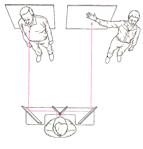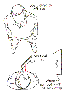 A Cheshire-cat demonstration is now an exhibit at the Exploratorium. A person sits in a booth while someone else sits on the other side of a counter running across the booth. Both sides of the booth are covered uniformly with white Formica circles. In front of the observer is a vertical rod to which a double-sided mirror is hinged. By rotating the mirror about the rod the observer can choose which eye sees the featureless Formica reflected in the mirror. In either position one eye views the second person. To erase that person's face the observer moves a hand across the reflected Formica. You can produce the Cheshire-cat effect by simpler means. Prop a pocket mirror vertically at the edge of a table or hold it with a steady hand. Turn it so that it reflects the scene on your right. The scene should consist of a vertical white surface bearing a simple line drawing. A large sheet of white paper with a few dark lines will serve. Put your face at the edge of the table and adjust your view so that your right eye sees the reflection of the white surface and your left eye looks across the table. Have someone sit on the other side of the table in sight of your left eye. To eliminate part or all of the person's face, pass your right hand through the reflected view of the white surface. To eliminate your view of the line drawing, pass your left hand through the view from your left eye. In a similar arrangement I substituted a portable television set for the white surface. My right eye saw the screen and my left eye saw my wife working at the table. When the characters on the screen were stationary, I could partially fuse the two views. When a character moved, gestured or spoke, the corresponding part of the view of my wife was erased. When the scene changed as the camera switched to a new angle, my wife totally disappeared for several seconds. Try as I might, I could not overcome the phenomenon by concentration. I was also able to demonstrate erasure without a mirror. After securing the unbound end of a writing tablet with a rubber band, I propped the tablet upright on a table with the long side horizontal and at right angles to the table edge. I positioned my head so that the tablet bisected my view. My left eye saw the tablet's colorful cover and my right eye saw the drab cardboard backing. The tablet occupied about 84 degrees in the nasal field of view of each eye. Usually my left eye dominated, but there was a perplexing fusing of the two views with frequent oscillations between them. When I moved my hand through either view, the view from the other eye was eliminated for a few seconds.