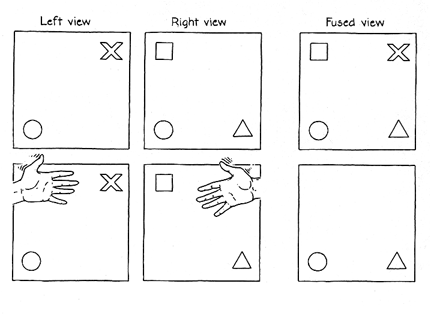 To test how motion can selectively erase part of a view, Duensing and Miller arranged for an observer to see two fields containing shapes [left]. When hands were waved in the upper left of the left-eye view and the upper right of the right-eye view, the top half of the fused view was immediately erased. Any of the geometric shapes could be erased by moving a hand through the corresponding field of view for the opposite eye. In a related test an observer saw a different face with each eye. If the faces were stationary, they could be partially fused. When part of one face moved, the corresponding part of the other face disappeared. For example, if one person rolled his eyes, the other person's eyes disappeared. If both people rolled their eyes, fusion was reestablished, with the perplexing result that two irises moved in each of the two eye sockets of the composite face. In binocular viewing one eye dominates the other in determining what perspective is brought to consciousness. Test yourself by focusing on a nearby object. Close your left eye and note the perspective your right eye has of distant objects. Repeat the procedure using only your left eye. With both eyes open, which of the monocular perspectives more closely matches the perspective of the distant objects now seen binocularly? In my case the left eye usually dominates. In the Cheshire-cat effect does a wave of a hand in the field of view of the dominated eye erase the view of the dominant eye as readily as the other way around? For me it does. A few of the people I tested report that erasure is more easily triggered by motion in one view than it is in the other. Erasure can be modified by the illumination of the two scenes. Duensing and Miller found erasure is more complete when the background seen by one eye is bright. If the face is also well illuminated and the observer fixes his gaze on the eyes, the eyes will end up glowing when a hand is waved through the other scene.