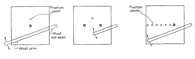 The square sometimes disappeared only in part, growing faint on one side or another. The duration of its disappearance was hard to predict. Sometimes it came back suddenly and at other times it came back slowly. Grindley and Townsend suggested that the sudden reappearance might be due to a saccadic eye movement, an involuntary jerk of the eye. Presumably the apparent motion of the left-eye scene resulting from the saccadic movement caught the attention of the brain, restoring perception of the square. When the observers were told to follow the rotation of the arm, the square never disappeared. In another set of trials two squares were placed at the same height on the cardboard seen by the left eye. The wood arm was shortened so that it appeared to pass over only the square on the right. Most often only that square disappeared, but occasionally both of them vanished. Grindley and Townsend also experimented with complex displays in one or both views. When the arm passed over an object seen by the right eye, an object in the corresponding position in the view from the left eye disappeared. Sometimes when the arm seemed to touch the edge of a drawing or something that could be interpreted as being solid, the entire object immediately disappeared. Erasure depended on the rotational speed of the arm. It was most frequent when the arm moved at 20 degrees per second. It was half as frequent when the speed was decreased to five degrees per second or increased to 90 degrees. The duration of erasure did not seem to be influenced by the rotational speed. Grindley and Townsend also found that the proximity of the square and the point on which the left eye was fixated strongly affected the ability of the wood arm's motion to erase the square. They mounted the square on the right-hand side of the cardboard seen by the left eye and had the observer fix his view at a point to the left of the square. First he viewed a point far from the square. After a number of trials he moved his fixation point closer to the square for more trials. As the fixation point approached the square, the frequency with which the square disappeared fell off.
