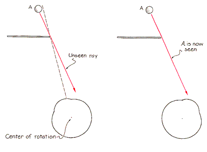 How does the human visual system achieve the Cheshire-cat effect? I am not certain of the answer but can offer a speculation. Normally the system attempts to fuse the views from the eyes to produce a single, sensible view. The point of concentration is wherever the eyes are focused, because that point produces an image on the fovea of each eye. The fovea produces the most acute vision. The other parts of the scene appear as less distinct images on the rest of the retina. Perhaps as an aid to survival the visual system is "wired" to be alert to motion in the peripheral part of the view. Look straight ahead at a stationary scene. Wave your right hand on the far-right side of the scene in such a way that your left eye cannot see the motion. If your eyes were seeing separate scenes as in the demonstrations of the Cheshire-cat effect, the motion would erase the far-right section of what you see with the left eye. Since your eyes are seeing approximately the same scene from slightly different perspectives, there is no apparent erasure. I believe that in fact there is an erasure but that there is no evidence for it after fusion brings the scene to consciousness. Either the erasure is too far from the line of sight to gain attention or all the detail lost by the left eye is filled in by the right eye. I tested my hunch by placing two brightly colored, separated objects on the opposite side of the room. Then I positioned two nearby obstacles so that only my left eye saw the colored objects. When I fixed my gaze on a point between the colored objects, I saw both of them because my left eye was dominant. When I waved my hand at the far right of my right-eye view (my left eye could not see the motion), the rightmost object disappeared. The object at the left was still visible. It is evident that I can erase part of a scene in normal viewing. Why, during a Cheshire-cat effect, does motion through the full view of one eye sometimes leave part of the view of the other eye unerased? What survives is the part that produces an image on the fovea of the eye in which erasure seems to take place. Erasure is due to a warning system monitoring what is seen with the rest of the retina. For the same reason erasure is absent if your eye follows the moving object. Since the object then always produces an image on the fovea of that eye, the warning system leading to an erasure of the view from the other eye is not triggered. The rhino-optical effect was named by Alistair P. Mapp and Hiroshi Ono of the University of York in England The name stems from the fact that the eyes of a rhinoceros are separated by a large protrusion of the skull. The effect is easily demonstrated. If you wear glasses, remove them. Close your left eye and fix the view from your right eye on an object directly in front of you. Slowly bring a finger of your left hand forward from your left ear, being careful not to move your right eye. When the finger first moves into view, hold it steady in that position Without turning your head, rotate your right eye toward the finger in order to see it. If the protrusion of the bridge of your nose is large enough, the finger disappears behind it. If you turn your eye forward again, the finger reappears. A similar disappearance of an object viewed directly was described in 1844 by the British investigator David Brewster, who is remembered for his work in optics and vision. To repeat , his demonstration cut a rectangular . opening in a sheet of cardboard. Hold the sheet several centimeters in front of your right eye and close your left eye. Have someone place two narrow objects several centimeters away from the other side of the sheet. While you fix your gaze on the left side of the opening, have object A positioned so that it is barely occluded by that side of the opening. Have object B positioned so that its right side is barely visible along the right side of the opening. When the objects are in place, you can see B but not A. Without moving your head shift your gaze to the right side of the opening. A appears and B disappears. If you again turn your gaze to the left side of the opening, A disappears and B reappears. Brewster termed this effect ocular parallax. In the rhino-optical demonstration the bridge of your nose functions as the left side of the opening and your finger serves as object A. The finger is visible only when you look away from it. Both demonstrations depend on the fact that the region in which the light rays are refracted by the eye (in the cornea and the lens) is separated from the center point about which the i eye rotates. Assume that all the refraction in the eye can be represented by a lens at the front of a spherical eye. When the eye looks directly at A, none of the light rays from it reach the lens and so A is not seen. The rays that travel toward the eye are blocked by the obstacle (either the bridge of the nose or the left side of the rectangular opening). The rest of the rays travel in the wrong direction. When you rotate the eye rightward about its center point so that it looks directly ahead, the action moves the lens into some of the rays from A that skirt the edge of the obstacle. The lens refracts those rays onto the retina so that A is seen. The image is blurry but recognizable. Mapp and Ono found that the rhinooptical effect does not work for everyone. If the bridge of the nose is flat, as it was in the case of the East Asians they tested, the observer sees the finger better when the eye rotates to view it directly. You can obtain a similar result if you look directly ahead with your right eye only (your left eye is closed) while moving a finger of your right hand forward from your right ear to the point where the finger first becomes visible. When you then rotate your eye toward the finger, more of the finger becomes visible.