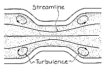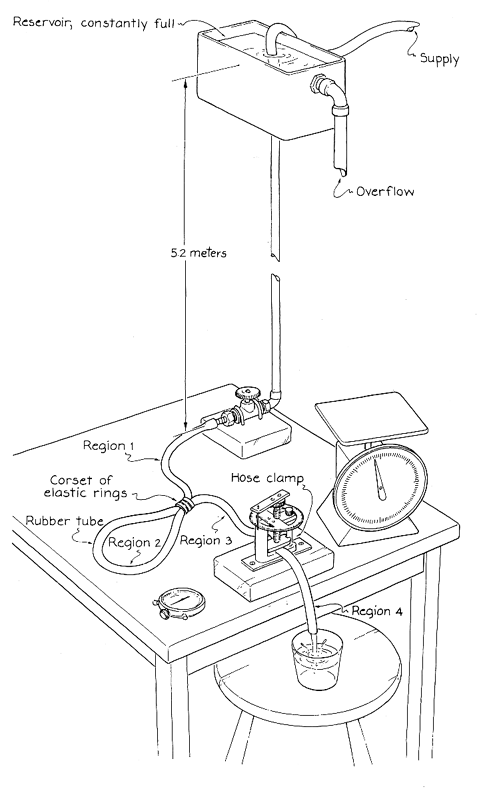 Werner J. Gatzek, a physician in Waynesboro, Va., recently surprised me with a related demonstration that ruffled my certainty. He was trying to model the flow of liquid through a human kidney because some properties of the flow had confounded medical researchers. In his experiment water drained through a garden hose from an elevated reservoir that was kept full. The lower end of the hose was connected to a rubber tube that included a loop along its course to simulate the arrangement of the input and output vessels of the kidney. The loop was held in place by a short corset consisting of three sections cut from the end of the tube; Gatzek forced the tub through the corset by stretching the sections with two needle-nose pliers. A screw clamp was mounted at the free end of the tube to simulate the variable resistance experienced by the output vessel of the kidney. The tube lay flat on a workbench, so that there were no variations in height along its length to affect the flow. Gatzek measured the rate of flow through the system by collecting water in a small container for a measured time and then weighing the water on a dietary scale. Initially the flow was a trickle because of the constriction from the corset. While continuing to measure the flow rate Gatzek gradually tightened the clamp by repeatedly turning the screw through a measured angle. Initially the flow rate remained constant. Then, when the tube had been narrowed appreciably, the rate suddenly and dramatically increased. Eventually it reached a level more than five times higher than it was when the clamp was fully open. Further tightening of the clamp reduced the rate, which reached zero when the clamp was fully closed. How could closing the clamp increase the flow rate? Surely the tightening of the clamp must introduce turbulence, thereby reducing the energy of the flow and the flow rate. Nevertheless, constraining the flow somehow increased it. Once the clamp was fully closed Gatzek started opening it by specific increments, again monitoring the flow rate. This time a wider opening of the clamp was necessary to achieve a peak rate, which was higher than the peak rate attained while he was closing the clamp. When the peak was reached, further opening of the clamp suddenly decreased the flow rate until it had again become a trickle. When Gatzek plotted his measurements of flow rate versus clamp aperture, the graph revealed a hysteresis (a lag) in the pattern. Why did the system behave in a different way when the clamp was being closed? The details of Gatzek's experiment offered no easy solution to the puzzle. The water reservoir was 5.2 meters above the workbench. The tube, made of amber latex rubber, had a thin wall and an outside diameter of five millimeters. (The characteristics of the tube Z are not critical, but it should be thin-walled and expandable.) The loop was 22 centimeters long, and the sections of the tube that served as input to and output from the loop were respectively nine and 10 centimeters long. The three sections of the corset were each one millimeter wide.