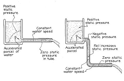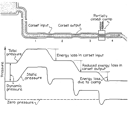 I took another approach to the puzzle by focusing on the energy. The point that intrigued me was that although tightening the clamp is certain to remove energy from the flow, the flow actually then becomes more energetic. To follow my steps in solving this paradox you must first understand several general features of water flow. The flow rate through a tube is equal to the product of the speed of the flow and the cross-sectional area of the tube. Along the tube the flow rate must be constant, and so there can be no magical appearance or disappearance of water. If the tube narrows, the water must flow faster; if it widens, the water must flow slower. If the tube does not change in width, the speed of flow will not change. When the flow lacks turbulence, it is said to be laminar. In such a state it can be traced by streamlines that show where individual parcels of water travel. Every time a new parcel travels through any particular point in the system, it thereafter follows the path taken by all the parcels that preceded it through that point. Flowing water has two types of pressure: static and dynamic. Static pressure exists in a conduit even if the water is stationary; only where the water is in direct contact with the atmosphere, as at the end of a hose, is there no static pressure. Dynamic pressure is proportional to the square of the flow speed. The pressures are related to energy. The static pressure is a form of potential energy per unit of volume; the dynamic pressure is the kinetic energy per unit of volume. If the flow changes in height, the gravitational potential energy per unit of volume must also be considered. The Bernoulli equation, named after the 1 8th-century Swiss mathematician Daniel Bernoulli, states that in laminar flow the sum of those energies must be constant along a streamline. Suppose the water flows through a horizontal tube that narrows. As water enters the narrow section its speed and kinetic energy (dynamic pressure) increase because energy is transferred from the static pressure. If the tube returns to its former width, the energy is transferred back to static pressure. At all times the sum of the static and dynamic pressures is unchanged. Suppose the tube descends without any change in width. As water flows through the tube, gravitational potential energy is converted into static pressure. Again the sum of the energies is unchanged. The Bernoulli equation and the requirement that the flow rate be constant through a system are not sufficient to explain Gatzek's experiment. If the flow were laminar, the flow rate through the corset would be the same as it is when the corset is removed. The fact that the flow is only a trickle indicates the corset introduces enough turbulence to remove nearly all the energy in the flow. I believe that when the clamp is tightened the flow rate increases because the loss of energy in the output tube within the corset is greatly reduced.