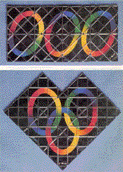 One side of the puzzle displays three separated rings. On the back side the rings are in disarray. The challenge is to realign the squares and thereby form the rings on the back side. If you succeed, the rings interlock. The puzzle is then an incomplete three-by-three array missing one corner square. One can go about solving the puzzle by random manipulation of the squares, flipping them in various ways as allowed by the thread hinges. A systematic study offers a better approach and displays several subtle mathematical properties of the puzzle. Recently Wolfgang Glebe presented such a study in Spektrum der Wissenschaft, the German edition of Scientific American. Here I repeat his analysis and give a solution to the puzzle that was found by one of his readers. It may be the shortest solution in the sense that it requires the fewest manipulations of the squares. Turn the disarrayed side face up, with the long edge horizontal and the copyright symbol in the upper row. Attach a small label to each square. Beginning with the upper left square and moving to the right, number the labels. This arrangement of the squares and numbers is said to be state 0, symbolized as ZO. In this state the squares are in a certain location with respect to one another and the numbers are in a certain orientation. How many other unique states can the puzzle have when it is in a two-by-four array? You can change the locations of the squares while also reorienting the number on each square. Arrangements that amount to a simple rotation of the entire puzzle should not be considered unique. Mirror-image arrangements should also be excluded. Nevertheless, a calculation suggests there should be about 1.3 billion unique states. Glebe found that the calculation is misleading: there are only 32 unique states. The reduction in number results from the way the squares are attached by the thread hinges. A square is always attached to the same two neighboring ones, although their relative orientations can change. For example, square 1 is always attached to squares 2 and 5 and square 2 is always attached to squares 1 and 3.
