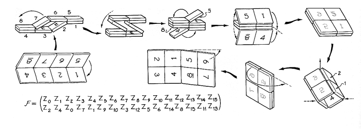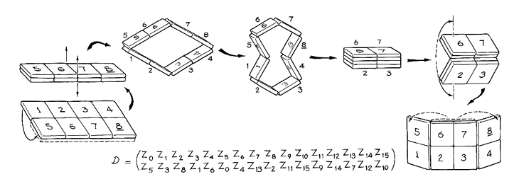 The next task is to find ways of transforming ZO into the other symmetrical states. Glebe designates one method as operation D. Here again the first step is to fold the rows 15 around the horizontal center line, either backward, which is appropriate when the initial state is ZO, or forward. The success of the second step depends on the choice of folding direction. If the puzzle cannot be made to take the second step, return to the initial arrangement and do the folding the opposite way. In the second step you expand the puzzle into a loop and then push in the left and right sides, allowing the top and bottom pieces to collapse onto them. The next step requires the stack to be opened. Depending 15 on the state of the puzzle when you begin the operation, you may need to turn the stack over at this point. You cannot go wrong. If the stack cannot be opened, turn it over and try again. Finally, open the puzzle fully by folding the side flaps outward. Operation D transforms Z0 to Z5, another symmetrical state in which the rows are interchanged with no reorientation of the numbers on the, squares. This operation is also involutory. If you do operation D on Z5 to return to Z0, you will find that the folding and unfolding usually go in directions opposite to those you employed previously. The table in Figure 1 indicates how operation D alters the other symmetrical states. For example, it transforms Z1 into Z3 and vice versa. A concise way of writing the transformation is D(Z1) = Z3. Operation E is similar to D. You again fold the rows backward onto themselves and then pull the layers apart to form a loop. This time you make the top and bottom of the loop concave and then push the left and right sides inward to collapse on the top and bottom pieces. The next step requires that the group of squares be unfolded. For some initial states the step is immediately successful. For others you must turn the puzzle about a vertical axis for the step to work. You cannot go wrong here because the puzzle cannot be made to unfold erroneously. Next reach behind the plane and unfold the top and bottom flaps. The final product is Z3, another symmetrical state. Thus E(Z0) is equal to Z3. If you transform Z3 back to Z0 with operation E, the first fold is opposite to the one shown in Figure 7. The transformations of the other symmetrical states resulting from operation E are listed at the bottom of the illustration. Operation F is quite different from D and E [see Figure 6]. Starting from Z0, fold the