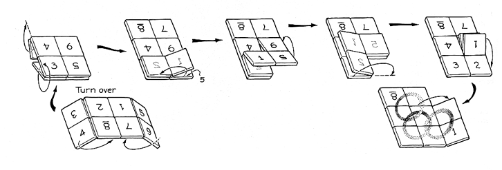 Suppose a series of operations is performed on one of the symmetrical states other than ZO. Is the product a new state? It is not, as can be seen in one of Glebe's examples. Consider DFEF(Z14). The first operation, F, produces Zll, as determined from the table in the illustration of F: DFEF(Z14) is equal to DFE(Z11). Continue the procedure: DFE(Z11) = DF(Z7) = D(Z3) = Zl, which is a known state. Since no new states can be produced with any combination of operations D, E and F, the permutations listed in the table are said to be closed. Glebe points out that in some cases a series of operations can be abbreviated. The permutation DE offers an example. Start with ZO. Fold the rows back onto each other. Then pull at the center on the top and bottom sides of the double layer to separate the layers into a loop. Continue pulling until the left and right sides touch, forming a new double layer. When you unfold the double layer, you have Z1. All this work is a warm-up for solving Rubik's Magic. The trick is to find a means whereby one of the 32 two-by-four states can be changed into a three-by-three state with one corner square missing. Glebe discovered two ways, one of which requires 20 operations. A reader of his article found a simpler method, which is shown in part in the bottom illustration in Figure 5. Begin with operation R on Z0 and then follow the instructions. The interlocked three rings are finally revealed when the flap on the right is folded to the right. Many other techniques of ferreting out a solution to the puzzle can be found in the book by James G. Nourse listed in "Bibliography". The book also contains procedures for forming the puzzle into a variety of shapes.