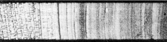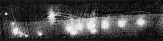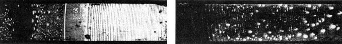 Tape peeled directly off the film leaves images, but are they really due to visible light from sparks? Or might they instead be created when the emulsion is struck by particles, acted on by chemical species from the tape or illuminated by ultraviolet light from the sparks? To check for these other possibilities, tape was first peeled off a glass slide placed on the film. The slide was chosen because it blocked particles and chemical species and absorbed ultraviolet light. The images left under the slide were then compared with those produced when the tape was peeled directly off the film. The two sets of images differed only in sharpness (because the slide spread the light), indicating that visible light from the sparks must be the only significant source of the images on the film. After these early trials, tape was peeled directly off the film, normally a few seconds after being applied. To produce the autographs in Figure 1, the transparent and filament tapes were peeled from left to right off Type 146 film, with the rate of separation accelerating from about one millimeter per second to about five millimeters per second. In both cases the pull on the tape was perpendicular to the plane of the film. Part of the autograph is striped. The rest of the display has many individual images that apparently were produced by rapid, intense bursts of light, making the autograph resemble a gathering of fireflies. Under magnification the structure of some of the individual images suggests that they were produced by sparks flashing parallel to the film surface. The faster rate of separation produces more pronounced stripes for the transparent tape, whereas for the filament tape a slower separation works best. The stripes result from periodic variations in the speed at which the tape separates from the film. The variations are similar to the "stick and slip" sequence observed when one surface slides over another surface. During the stick phase for the tape the separation is slow, yielding a few feeble sparks that barely expose the film. The sparks leave a dim (but not totally dark) line in the developed autograph. During the slip phase the separation is rapid, generating vigorous, bright sparks that trace a bright line across the film. Both bright and dark regions are lines running across the width of the tape-film interface, because the full width of the tape uniformly underwent either stick or slip. The sharp features in the pattern must be due to sparks near or on the emulsion, because the light from such sparks had no chance to spread. The more diffuse features probably derived from sparks farther from the emulsion, perhaps along the tape surface after the surface was lifted from the film. Dark circles left in an autograph are caused by air bubbles trapped under the tape when it was applied to the film: charged patches are not created in a bubble area, because the tape is not in contact with the film. Defects in the tacky side of the tape also produce regions that do not spark, thereby leaving unexposed regions on the film.