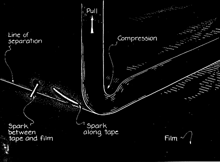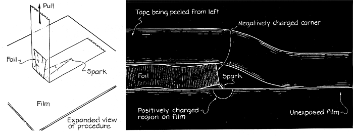 of bright, isolated sparks. How the peeling proceeds depends partly on the type of surface to h which the tape is attached. A variety of surfaces can be tested, but only k; transparent ones serve to expose film. A microscope slide works but produces blurred images because it is thick enough to allow the light from a spark to spread before it reaches the film. Dickinson and Donaldson studied the glow characteristics of 3M Scotch Brand Magic Transparent Tape (No. 810) and 3M Scotch Brand Filament Tape (No. 893). The adhesive on the transparent tape is alkyl acrylate and the backing is cellulose acetate. The adhesive on the filament tape is natural rubber combined with a "tackifying" agent. The sticky face of the tape has more of the agent than the interior does, where glass filaments are bound to the polyester backing. The film types, all Polaroid brands, were chosen for their variety of surface coatings and sensitivity to light. Type 146 has an ISO rating of 200 and is uncoated. Types 47 and 107C are rated at 3,000 and have a gelatin coating. Type 612 is rated at 20,000; the nature of its coating is proprietary information. The films were loaded into the opened rear section of Polaroid cameras that accommodate them, with the emulsion side of the film exposed h for experimentation. When the room lights were on, the loaded film was protected by an opaque black card. With the lights off and the card removed, tape was pressed onto the film with a finger. After a few seconds it was peeled off and another tape was applied to a different area of the film. After two or three tapes had been peeled, the film was developed in the usual way by bringing it in contact with the developing material. Dickinson and Donaldson wondered if any residue left on the film by a peeled tape might create artifacts in the final pictures. They found no evidence that any residue interfered with the film's development or its sensitivity to light.
