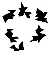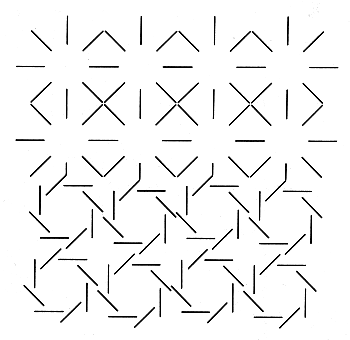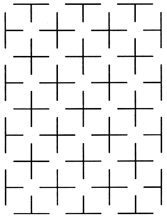 produces bright spots as in the Ehrenstein illusion, whereas the bottom half fails to produce any illusion. Note that the bottom half is filled with lines that could be described as being tangential to circular spots like those in Kennedy's patterns. The spots are not apparent, however, and there is no unusual brightness. Now move away from the illustration. When you are at an appropriate distance, the bright spots in the top half almost disappear, and now the bottom half seems to be filled with spots that are somewhat darker than they should be. Squinting greatly improves the illusion. The illustration at the right, also from Fraser, contains an embedded pattern. When the illustration is viewed from a normal distance, the pattern is almost impossible to perceive. If you move away from the illustration and squint, a slightly darkened figure appears. It is generated by the spots that are surrounded by tangential lines. In 1981 Lothar Spillmann and Christoph Redies of the Neurological Clinic of the