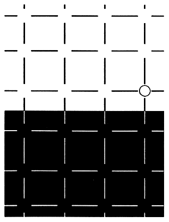 A different kind of illusion can be seen in the incomplete grids in Figure 5. The illusion was first investigated by W. Ehrenstein and is now named after him. If you avoid fixation, you will see a circle, square or blob at the points where the lines would intersect if the grid were completed. The figures are particularly bright in the grid of black lines and particularly dark in the grid of white lines. In both cases the figures probably appear" to lie above the grid, seemingly hiding intersections of the lines. The illusion is just as apparent if you examine a single cell of the grid, with only one incomplete intersection. If you fix your gaze precisely on the region of intersection, however, the brightened or darkened spot there disappears. It also disappears if you add a circle around the intersection region. A striking variation of the Ehrenstein illusion can be seen in the illustration at the right below: in addition to bright spots at the regions of intersection you also perceive bright diagonal streets connecting the spots. What accounts for these illusory spots and streets? The spots might be produced by a desire to close parts of the pattern by mentally superposing something that connects the ends of the lines at each incomplete intersection. Alternatively, the spots might come about because of the contrast in brightness between the ends of the lines and the space at the incomplete intersection. A third possibility is that you mentally add depth to the pattern, transforming a flat drawing into a grid whose intersections are hidden by small spheres orÑin the case of the streetsÑby another grid laid on top of the actual one. This explanation seems to me to be important, because when I examine the illustrations, I have a strong perception of depth.