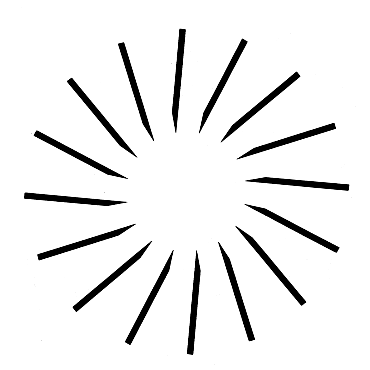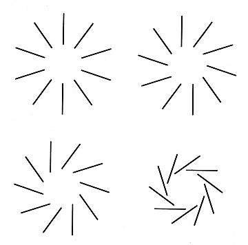 In the late 1970's John M. Kennedy of the University of Toronto invented a variety of illusions that appear to be related to the Ehrenstein illusion. In the first of the four patterns in the illustration at the upper left below, a simple layout of radial lines generates the illusion that a bright circle fills the center of the pattern. Kennedy argued that the illusory figure is due to the contrast in brightness between the inner end of the lines and the white center. According to theory, the region just beyond the end of a line seems to be brighter than it really is because it is close to the dark line. In the case of a single line, the brightening is imperceptible, but if several lines are grouped so that the brightened regions are adjacent or overlap one another, the brightening is quite perceptible. In the next three patterns in the group the lines are progressively reoriented, until they are finally tangential to the central region. As the reorientation continues, the illusion of a bright center weakens and then disappears. According to Kennedy, the reorientation of the lines shifts the regions involved in brightness contrast out of the central region. When the lines are tangential, the white space just beyond the end of each line is near another line; the space is not mentally brightened and the central region no longer exhibits the original illusion.