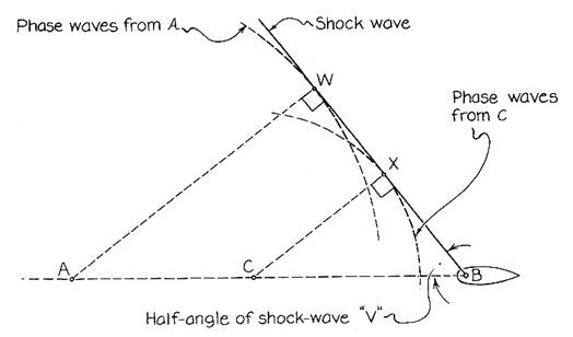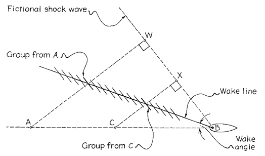 The transition between groups is so smooth that you may have trouble seeing it, particularly since the action passes you quickly. If you photograph the display to freeze the action and measure the crest-to-crest separations, you will see that the faster groups are ahead of the slower ones. The separation is greatest in the region farthest from the impact of the stone, indicating that the phase waves with the longer wavelengths are responsible for that region. The separation gets progressively shorter as you examine the water surface nearer the impact point, indicating that phase waves with shorter wavelengths come into play there. By making a series of photographs you can see the groups stretch out as the faster phase waves race away from the slower ones, until energy losses and the spread of the waves finally eliminate all action. A stone produces a single point disturbance. A moving boat creates a continuous series of point disturbances, each disturbance sending out expanding groups that interfere with one another to form the characteristic wake. Because Kelvin's solution to the interference problem is complex, I shall first give a much simpler account that was presented in 1984 by Frank S. Crawford, Jr., of the University of California at Berkeley. Crawford starts out by considering the shock wave a traveling boat would produce if water waves were not dispersive. In the illustration below a boat has traveled from A to B at a constant speed. Its disturbance at A sent out circular phase waves (all moving at the same speed, since we are ignoring dispersion). Phase waves were also created by the boat at each point between A and B, producing a composite pattern of circles of varying size, the boundaries of which form a V-shaped shock wave. By convention the angular extent of a shock wave is measured by the half-angle of the V. In the illustration the sine of that angle is equal to the ratio of the speed of the waves to the speed of the boat. The fictional shock wave serves as a benchmark for constructing the actual wake created by dispersion. Although the boat's disturbance creates phase waves with a wide range of wavelengths, apparently the only waves that are important are those with speeds no greater than the boat's speed. First consider a small packet of phase waves that differ only slightly in wavelength and that travel at or very close to, say, .866 of the boat's speed. When the boat reaches B, the phase waves that were generated at A reach Won the arm of a fictional shock wave that, according to the equation, is at an angle of 60 degrees to the boat's path. Identical packets that were produced by disturbances between A and B (say at point C) also reach the arm of the fictional shock wave just then. The shock wave is said to be fictional because the water along the arm is completely calm owing to the destructive interference of the phase waves there. The activity the phase waves do create is back in the groups that have traveled outward at half the speed of the phase waves [below left], and so the group associated with the phase waves reaching W is halfway between A and W. Draw a line between B and that halfway point. The line, which can be called the wake line, marks the current location of groups associated with the chosen phase waves that were generated at points between A and B.