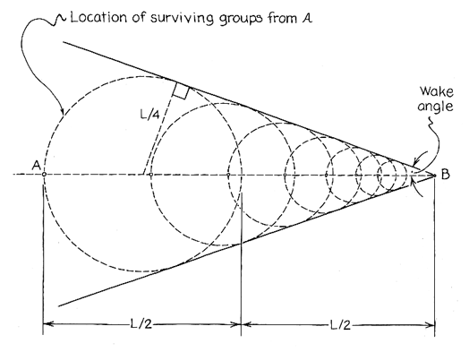 If the boat had generated only these chosen phase waves, the wake would be contained by the wake line, and the wake angle, measured between the line and the boat's path, would be 19.1 degrees. The calculation of the wake angle goes as follows. Let L be the AB distance. Since the phase waves were chosen to travel at .866 times the boat speed, W must be .866 L from A, and the midpoint between A and W must be .433 L from A. Since the right triangle formed by A, W and B has one angle of 60 degrees, the angle WAB must be 30 degrees. The wake angle can then be computed by applying trigonometric rules to the triangle created by A, B and the midpoint of AW. If you calculate the wake angles associated with other speeds chosen for the phase waves, you will find that the wake angle has a maximum value of 19.5 degrees, which corresponds to phase waves that travel at .82 times the boat's speed. The wake line at this maximum angle marks the boundary of the pattern. It is most apparent in the pattern because a wide range of phase waves contribute groups on or just inside the line, generating prominent crests and valleys there. The full angle of the V, twice the maximum wake angle, is 39 degrees, which matches what is observed in actual wake patterns. Crawford went on to consider the transverse waves in the wake pattern. They are due to the spreading out of groups toward the boat in circular arcs. Since the pattern remains stationary with respect to the boat, it must be dominated by a packet of phase waves that travel at, or only slightly above or below, the speed of the boat. The associated group, of course, travels at half the boat's speed. The packet created at A, then, creates a group that is halfway along AB when the boat reaches B. The other groups forming the transverse waves have a similar relation to the boat. If a group currently lies at a distance x behind the boat, it must have been created by a disturbance point that is now 2x behind the boat. Furthermore, the transverse wave that group forms must now have a radius of x. The composite pattern seems to be dragged along by the boat but is actually being re-created continuously by fresh phase waves as the transverse waves expand.