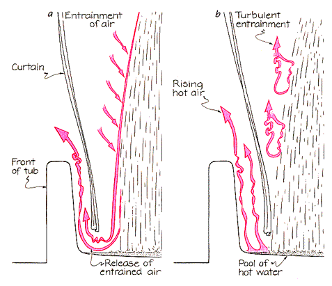 In order to eliminate convection, I next opened the hot-water valve until the shower water was within a degree of the room temperature. (I also adjusted the cold- and hot-water valves to maintain the original flow rate.) After allowing 30 minutes for the compartment to adjust to the new water temperature, I began probing the airflow with my candle. The horizontal circulation around the falling water was again clearly present near the floor and at intermediate heights, but now it was weak near the top of the compartment. Turbulent air flowed upward near the head wall. On the head-wall side of the falling water the entrainment of air was similar to what I had seen earlier, but on the foot-wall side the entrained air veered off toward the back wall to join in the horizontal circulation. As before, air flowed strongly outward at the bottom of the doorway, but now the inflow through the top half of the opening was weak. The most interesting aspect of the flow pattern was along the floor of the compartment. Air that was released from entrainment flowed away from the impact region. Some of it escaped immediately through the doorway; the rest was eventually forced upward by a wall and then into the horizontal circulation around the falling water. Next I cut off the cold water and increased the hot-water supply, again attempting to maintain the same flow rate. The water temperature rose to 51 degrees C. but then gradually dropped to 45 degrees as my water heater struggled to keep pace. The airflow within the compartment was remarkably different from that in the previous trials. Along the bottom of the doorway air flowed inward vigorously. The horizontal circulation around the falling water was missing except near the top of the compartment. Everywhere along the bottom of the compartment the candle revealed strong upward flow. Even the entrainment layers seemed to be modified: apparently the entrained air heated so rapidly that it broke free of the water and actually rose. I moved from the shower stall to the bathtub shower. My findings in the stall had taught me that convection can greatly alter the circulation system established by entrainment. In the bathtub I therefore first brought the shower water to room temperature in order to explore what happens in the absence of convection. The curtain moved into the shower compartment, most strongly near the falling water and near the head wall [see illustration above]. Air circulated horizontally around the falling water as it had in the previous trials. Air near the falling water was entrained, brought down to the tub bottom and then sent outward along the bottom until it was forced up by the side of the tub; where the curtain bulged inward, this upward flow sent the air out into the room. The only strong flow of air into the compartment that I detected was in the lower part of the small space between the head wall and the end of the curtain. When I turned on only cold water, the airflow pattern changed in two respects. Air poured out through the lower part of the space between the curtain and the foot wall and air flowed into the compartment over the top of the curtain. Otherwise the flow pattern was like the cold-water pattern in the shower-stall trials. When I turned on only hot water, most of the curtain bulged into the compartment; air flowed vigorously outward through the space provided by the bulge, except near the head wall, where it flowed inward [Figure 3]. At the bottom of the space between the end of the curtain and the head wall, air flowed into the compartment. At the foot-wall end of the curtain the flow h was chaotic but generally inward. The horizontal circulation had shifted to the top of the compartment; air in the bottom of the compartment rose turbulently. When the trials were completed, I finally understood why a curtain moves inward when I take a shower. Both entrainment and convection are important, but entrainment is the primary factor [see Figure 4]. Entrainment removes the air that is next to the falling water, except near the bottom. On the head and foot sides, additional air flows directly toward the falling water to replace the removed air, only to be itself entrained and removed. In the region between the curtain and the falling water the replacement is slow, because the air must flow first along the curtain and then toward the water. When the shower begins, the air pressure in that region drops as a result of that slow replacement. Since the air outside the curtain is at atmospheric pressure, the curtain billows inward. Although the bottom of the curtain is near where entrained air is released, the edge is pulled in by the higher parts of the curtain. The bulge along the bottom opens an avenue for air to flow into the room. The flowis nearly always outward, regardless of the relative air and water temperatures. If the water is at room temperature, the outward flow is air released from entrainment just below the curtain; it flows along the bottom of the compartment, upward outside the curtain and finally out into the room. If the water is colder than the room air, the outward flow is enhanced by convection as the chilled air escapes . into the room and warmer air flows over the curtain and into the compartment. The enhanced flow under the curtain may move the curtain in more than entrainment alone does. If instead the water is hotter than the room air, there may be little release of air under the curtain because the air entrained by the falling water quickly heats up and breaks off from the fall. The bulge in the curtain does, however, expose a pool of hot water on the floor of the stall (or the bottom of the tub). The pool heats the air above it, sending the air upward against the outside of the curtain and from there out into the room. The resulting extra push on the curtain is the reason the curtain may move inward more during a hot shower than during a cooler one. To sum it up, entrainment initiates the inward movem