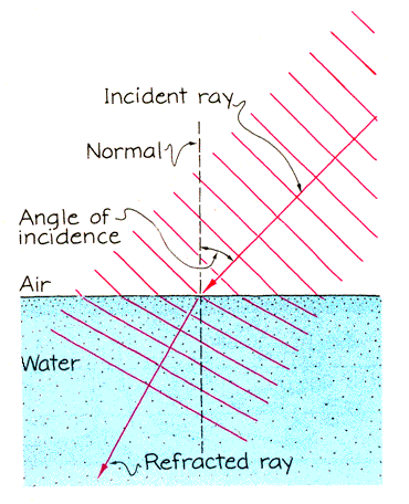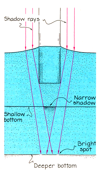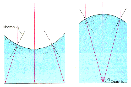 The puzzling aspects of these shadows are due to the fact that light is refracted at the air-water boundary. That is, its direction of travel changes because its speed changes. In a vacuum light travels at 3 x 108 meters per second, the ultimate speed in the universe. In air it travels slightly slower because it occasionally interacts with h air molecules along its path. In water, where it is slowed by interactions it with much more densely packed molecules, it travels at only three-fourths its speed in a vacuum. Textbooks commonly treat light as being a wave with a series of straight wavefronts; the direction of travel is represented by a ray perpendicular to the wavefronts. When the light is refracted through a boundary, the initial ray is called the incident ray and the final ray is called the refracted ray. The orientation of the incident ray is measured with respect to a line, called the normal, that is perpendicular to the boundary. If the boundary is curved, the normal is perpendicular to a tangent to the boundary at the point where the ray crosses. The angle between the normal and the incident ray is called the angle of incidence. If light travels from the air into a flat pool of water with the incident ray aligned with the normal, each wavefront slows uniformly as it crosses the boundary, and so the light's direction of travel does not change. For any other orientation of the incident ray, each wavefront crosses the boundary gradually. The part that first enters the water slows down before the rest of the wavefront does. The nonuniform reduction in speed produces a kink that moves along the wavefront and alters the wavefront's direction of travel: the light is refracted. The larger the angle of incidence is, the more the light is refracted. When the water surface is flat, a bundle of parallel rays is refracted equally and the rays illuminate the bottom of the pool uniformly. When the water surface is curved, however, the refraction is not equal. The rays have different angles of incidence, because the normals are oriented differently where different rays cross into the water. The nonuniform refraction gives rise to nonuniform illumination on the bottom of the pool. A concave surface diverges light rays, thereby decreasing the illumination in the region of the bottom where the rays would otherwise have gone. A convex surface converges light rays; the region where the rays cross, and where the light is therefore brighter, is called a caustic. Depending on the shape of the water surface, the caustic can be a point, a line or a three-dimensional "surface." If the bottom of the pool happens to intercept the caustic, you see a bright point or line on the bottom. If the bottom intercepts the rays either before or after they cross, it is illuminated somewhat, but not as brightly as it would be at the caustic.