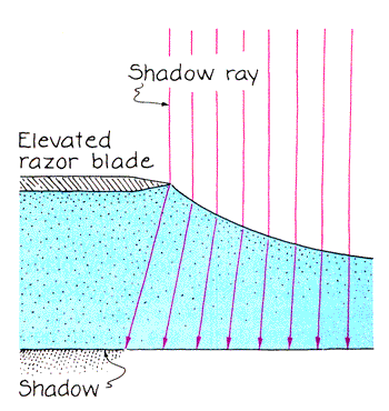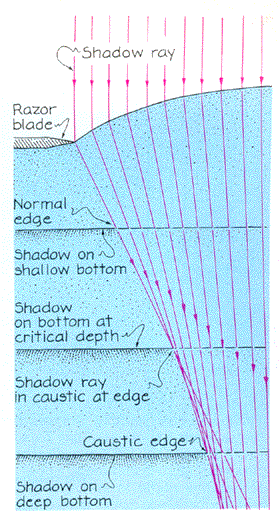 Along the curved water surface next to the blade's edge, rays are refracted so that they converge, but their point of focus depends on where they traverse the surface [see top illustration at right]. The surface curvature is greatest near the blade, and so rays entering the water there converge earlier than rays entering the water farther from the edge. Rays traversing the nearby flat surface do not converge at all. The ray that enters the water right at the edge of the blade is known as the shadow ray; if there were no water, that ray would always mark the border of the shadow. Consider another ray that is slightly farther from the razor's edge than the shadow ray is. The curved water surface focuses that ray and the shadow ray to form a caustic at a certain depth below the normal water level. Call that depth the critical depth. (In the illustration the bottom of the container is shown at three depths, the middle one of which is the critical depth.) Suppose you begin with about two centimeters of water in the container. The depth is less than the critical value (which in my experiments is about three centimeters), and so the bottom of the container intercepts the shadow ray and its neighboring ray before they cross. The blade's shadow is normal and the shadow ray marks its border. Slowly add water to the container while you monitor the shadow. As the water reaches the critical depth, the border of the shadow develops a caustic because it is at the focus of the shadow ray and its neighbor. Add more water to the container. A caustic remains at the shadow's border, but it is not formed by the shadow ray and its neighbor. The caustic is now due to two closely spaced rays that pass through- the water surface somewhat farther from the blade's edge. Since the surface curvature is less there than it is at the edge, the rays focus at a greater depth than the shadow ray and its neighbor. The shadow ray no longer skims the border of the shadow but falls in the illuminated region on the bottom of the container somewhat away from the shadow. The width of the shadow is no longer set by the shadow ray, as in a normal shadow, but by the caustic that encroaches on the shadow. If you continue to add water, the location of the pair of rays responsible for the caustic at the border of the shadow gradually shifts away from the blade's edge. The distance to the bottom of the container is increasing; the caustic is at the convergence of rays that pass through the water surface where it is less curved. The critical-depth value depends in theory on the weight of the blade. A heavier blade should depress the water more,