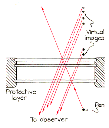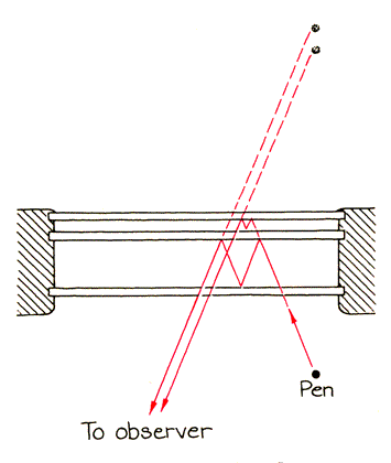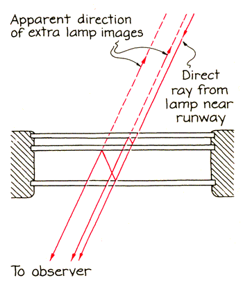 The reflections giving rise to the various images are indicated in the illustration at the left below. Each reflected ray is mentally extrapolated backward, so that it appears to have originated beyond the window. (For clarity the illustration has been simplified by assuming that the observer is far from the window; a single ray from the pen is responsible for the various reflections and images. Actually the observer is near the window and a slightly different ray from the pen is needed for each reflection; all the reflected rays converge at the observer's eyes. I shall ignore that detail here.) The images are dim because every time the light reaches a surface (either the front or the back of a layer) only a small fraction of the light is reflected; the rest of it continues to travel outward. The dimness of the images makes them hard to make out during daylight, when a flood of light comes to your eyes from outside the plane. If the night is dark and if the light reflecting off the pen toward the window is particularly bright while the cabin is otherwise dark, you may see even more images in the window. They are caused by multiple reflections between layers or even from the front and back surfaces of a single layer. For example, a ray from the pen can pass through the first layer and be reflected from the middle layer, be bounced back by the first layer and then reflected again from the middle layer before it reaches you [see Figure 4]. The bounced light creates another image of the pen, but this image is quite dim, because the three reflections leave a final ray of low intensity. You may notice other images in a window. Can you figure out how they develop from multiple reflections? I can see images arising from multiple reflections better when the aircraft is waiting for takeoff at night. I switch off the overhead light and examine a runway lamp either ahead of me or to the rear. Trailing off to one side of my direct view of the runway lamp there are images that must have been generated by multiple reflections from the window layers or from the front and back surfaces of a single layer [see illustration above left]. A runway lamp that is directly off to the side of the aircraft does not give such a display. The light from it does undergo multiple reflections, but the resulting images overlap and cannot be distinguished. When the light from the lamp reaches the window along a slanted path, the images due to multiple reflections between layers are separated enough to be distinguished; the images due to multiple reflections within a single layer are more tightly spaced and are harder to distinguish.