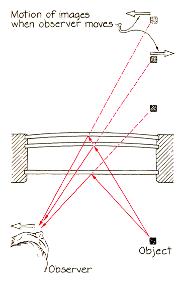 The image that lies closest to the direct view of the lamp results from a double reflection between the outer two layers of the window. The light passes through the outermost layer, is reflected from the middle layer and then back to the outermost layer before being reflected to my eyes. The next side image is caused by light that is reflected once from the inner layer and then once from the middle layer. Near by, but slightly farther from the direct view of the lamp, is an image due to light that is reflected from the inner layer and then the outermost layer. Other images may also be present, but they are dimmer, because they involve four or more reflections from the layers. Their positions depend on both the angle at which you peer into the window and the angle at which the lamp's light reaches the window. On a night flight recently I was seated on the right side of the plane in an oddly configured row where there was extra space between the window and my window seat. The space allowed me to peer back into the window just behind me. Before takeoff I sketched how the window yielded three images of an armrest of the seat behind mine. When I moved my head forward, the images maintained their relative spacing. Later, at high altitude, I again examined the reflections. This time their spacing was different. Also, when I moved my head forward, the outer two images moved in opposite directions: the outermost image unexpectedly moved forward and the middle one moved to the rear. I suspected the reason for the different spacing of the images and their odd movements was that the sealed layers in the window were no longer flat, having flexed outward as the air pressure decreased outside the aircraft. After making a few sketches I understood the images. The outermost one came from light rays that happened to be reflected from just to the left of the center of the outermost layer. When I moved my head forward, I intercepted a different set of rays, which were reflected from farther to the left of center. If the layer had been flat, both sets of rays would have seemed to originate at the same place outside the window, and the image I perceived there would have been stationary. Because the layer was curved, however, the second set of rays appeared to originate to the left of the first set, and so when I moved, the image shifted to the left with me.