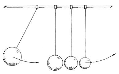 For example, if the ratio of the first ball's mass to the second ball's mass is 1.05, then the ratio of the second ball's mass to the third ball's mass should also be 1.05, and so on. That is about the right ratio if there are 100 balls inserted between the original two balls, which have a mass ratio of 100. The first, heaviest, ball strikes a ball that is only slightly less massive, and the first ball gives up nearly all of its energy. The second ball then collides with the third one, which is only slightly less massive, and again the transfer is nearly perfect. When the last ball is struck, it receives almost 95 percent of the energy the first ball had initially. Symmetry still holds: the same percent of energy is sent down the line of balls if the transfer goes in the opposite direction. If even more balls are inserted in the line and the masses are adjusted so that the mass ratio between successive balls is identical throughout the line, the transfer nears 100 percent. The reason is that with a longer chain the balls in each colliding pair are closer to being exactly matched in mass (in which case all of the energy would be transferred). If the balls are hung as adjacent pendulums, the release of the ball at one end sends energy through the chain until the last ball finally swings out and up. During the successive collisions the intermediate balls hardly move and there is little evidence of the energy transfer except for the clatter that sweeps along the line of balls. So far, the collisions have been considered to be perfectly elastic. The fact that in practice most collisions are inelastic changes the story. When the coefficient of restitution is less than the ideal value of 1, the transfer of energy worsens if the chain of balls is too long. Although a long chain means that the balls in each colliding pair are nearly matched in mass, the steady drain of energy from the balls into sound, vibration and deformation diminishes the energy reaching the last ball.