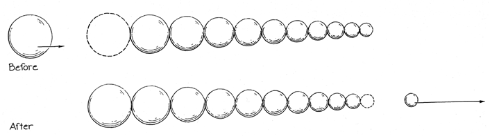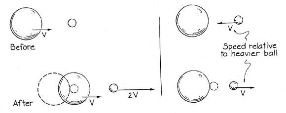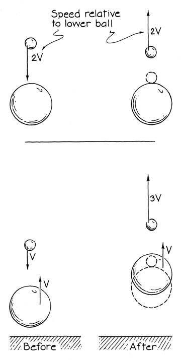 Hart and Herrmann calculated just how many intermediate balls are needed to maximize the energy transfer to the last ball for a given coefficient of restitution and for a given mass ratio between the end balls. If there are fewer balls in line, the consequent larger mismatch in mass between the members of each pair decreases the transfer; if there are more balls, the inelasticity of the collisions lowers the transfer. For example, suppose that the mass ratio of the end balls is again 100 but that now the coefficient of restitution is .99-only slightly less than perfect. The maximum transfer takes place when there are 22 intermediate balls. If the coefficient is .8 there should be only four intermediate balls. And if the coefficient is as low as .19, the best transfer (less than 2 percent) is obtained when the first ball hits the last ball directly. In all the examples, the transfer maintains symmetry. What conditions will maximize the speed imparted to the last ball? Start again with the case in which there are only two balls and the collision is perfectly elastic. More speed is imparted to the second ball if its mass is small compared to that of the first ball. In the limit where the mass ratio is infinite, the second ball is given a speed that is twice the first ball's initial speed. With such a mass ratio, however, the energy transfer is minuscule. The result may be perplexing. How can the second ball be given its greatest speed when it gains only a tiny amount of energy? The answer lies in the fact that its mass is so small. If it is given even a small amount of energy, its speed will be large. Here is one way to derive the speed of the second ball without resort to any equations. Let V be the speed of the first ball. When the mass ratio is very large, the speed of the first ball hardly changes during the collision. Picture the collision from the perspective of the first ball, as if you could somehow ride along with it [see illustration below]. Before the collision the second ball (which is actually stationary) appears to approach you and the first ball with a speed V. If the collision is perfectly elastic, the second ball appears to bounce off the first ball and then move backward with a speed of V relative to the first ball. Since the first ball still has a speed that is approximately V, the speed of the second ball is actually V + V, or 2V. In 1972 James D. Kerwin of the California State Polytechnic University in Pomona reported calculations on a chain of collisions, where each collision is perfectly elastic and involves a massive ball hitting an infinitely lighter ball. The speed doubles with each collision and, if there are n intermediate balls, the last ball ends up with a speed that is 2n times the first ball's speed. Obviously a long chain results in a fantastic final speed. Several lessons can be learned from these examples of chain collisions. The extent of energy transfer depends on elasticity and mass ratios; if the masses are chosen properly, the last and lightest object can end up with much of the energy or with a large speed, but the mass ratios required for those two end results differ. These lessons apply to the chain collisions when a stack of balls is dropped on the floor. The ball on the bottom rebounds from the floor and then runs into the second ball in the stack. The second ball rebounds from the first ball and then runs into the third ball, and so on until the top ball is reached. In each collision in the chain, the energy transfer and the speed imparted to the higher ball depend on elasticity and mass ratios.